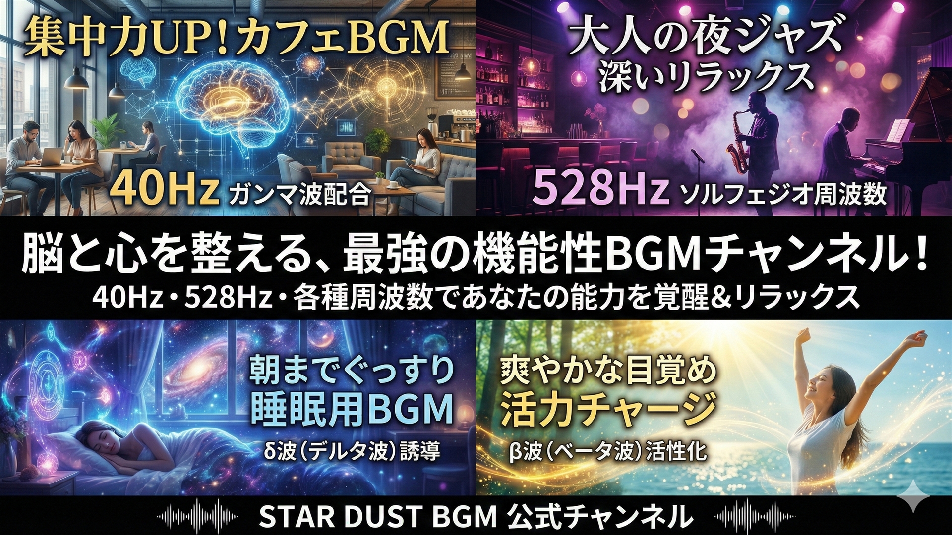 YouTubeチャンネルページ用のメインアイキャッチ画像。40Hz、528Hz、ジャズ、睡眠、作業用の各要素を視覚化した4分割デザイン。CTR向上のためインパクト重視で作成。