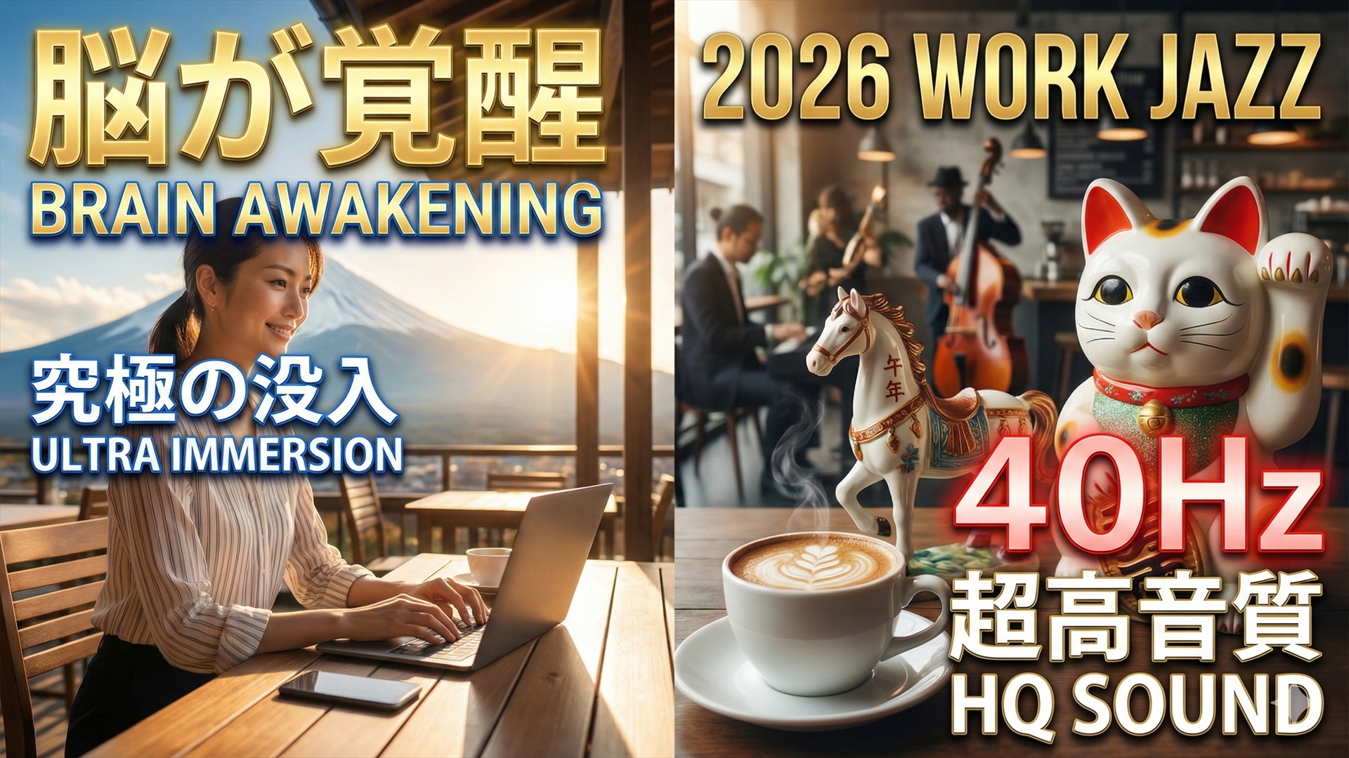 work-jazz-focus-2026-v2-youtube 最終更新日時 : STAR DUST BGM【アイキャッチ用】2026年新春向け作業用BGM記事。左:富士山と脳覚醒・没入のテキスト。右:カフェと招き猫・午の置物、40Hz・超高音質のテキスト。合成画像。