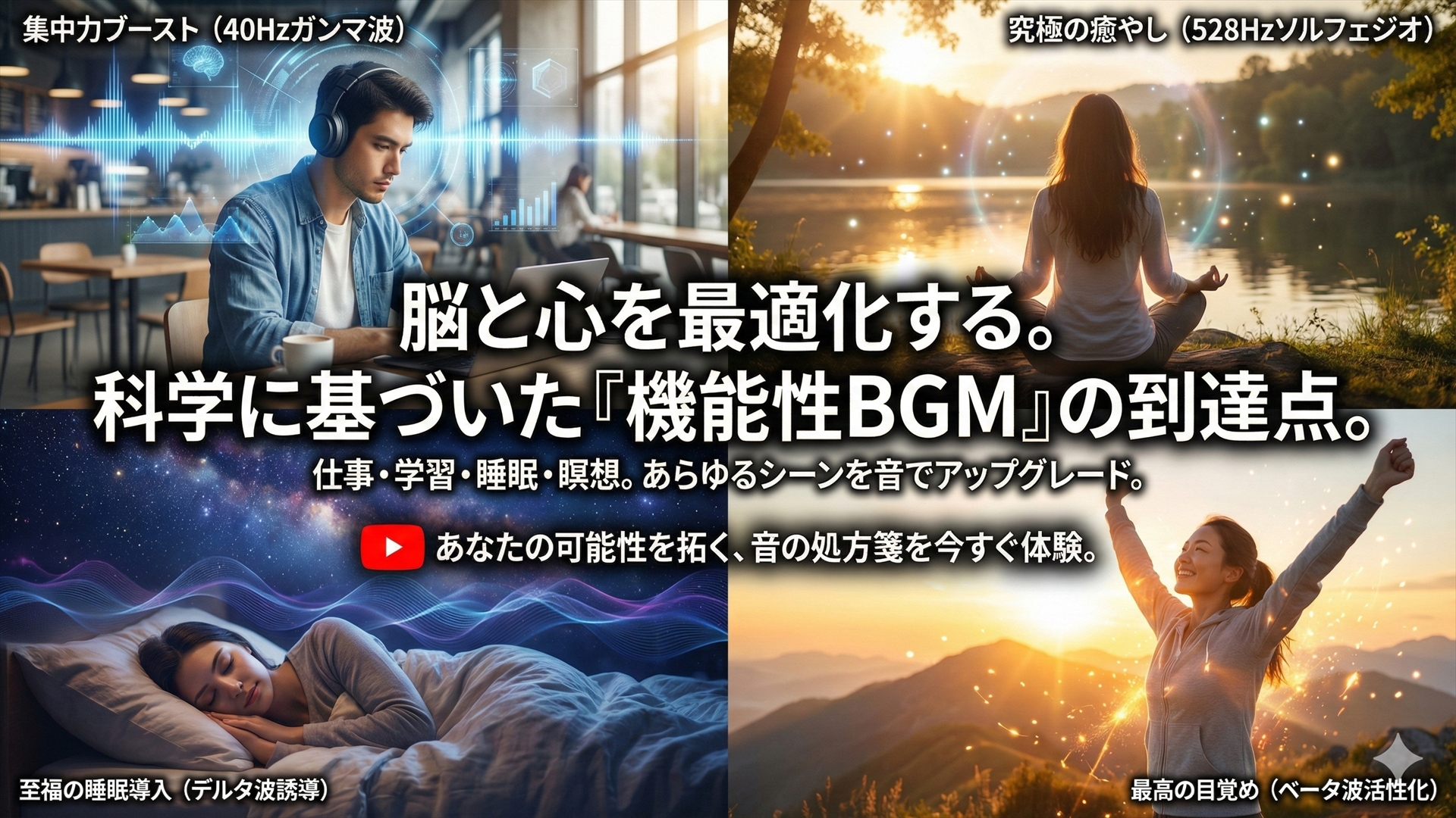 トップページYouTubeリンク用4分割アイキャッチ。40Hz(集中)、528Hz(睡眠)、β波、δ波などの機能性を訴求し、クリック率(CTR)を高めるデザイン。